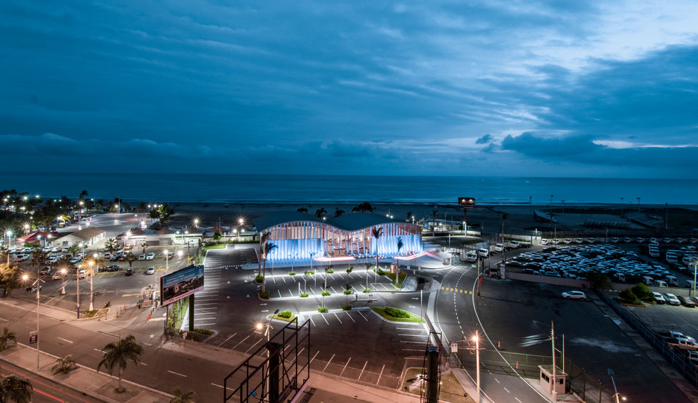 The Cruise Terminal of Manta recalls the undulating motion of the sea. Dynamic aluminum trellis shapes the façade and protects the building from solar radiation. Diagonal patterns on floors and walls allude to the sway of sea waves, and its curvilinear canopy evokes the marine quality of its surroundings. The truss structure holding this canopy weaves itself with thin, metallic columns below, granting a sense of lightness and grandeur to the project. A suspended, stingray-shaped system of warm LED profiles lights the hall, accommodating the various needs of travelers and other users alike.