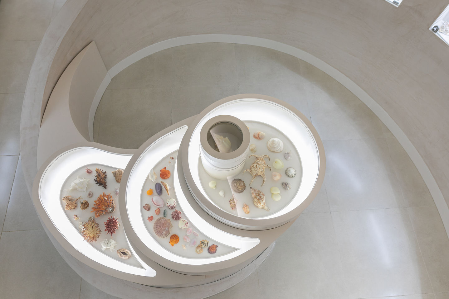 Inspired by the golden ratio seen on the composition of seashells, the exhibit is designed as a shell that envelopes its visitors. As you walk along the curved walls, they gently descend into the floor, mirroring the way shells blend with the sand. The minimalist elegance of beige and white creates a serene backdrop, accentuating the seashells' inherent elegance and inviting visitors to explore their beauty. The organic circulation guides you until the centered origin, a discovery point for the most exceptional seashells, surrounded by the sound of the ocean played through the audio system.